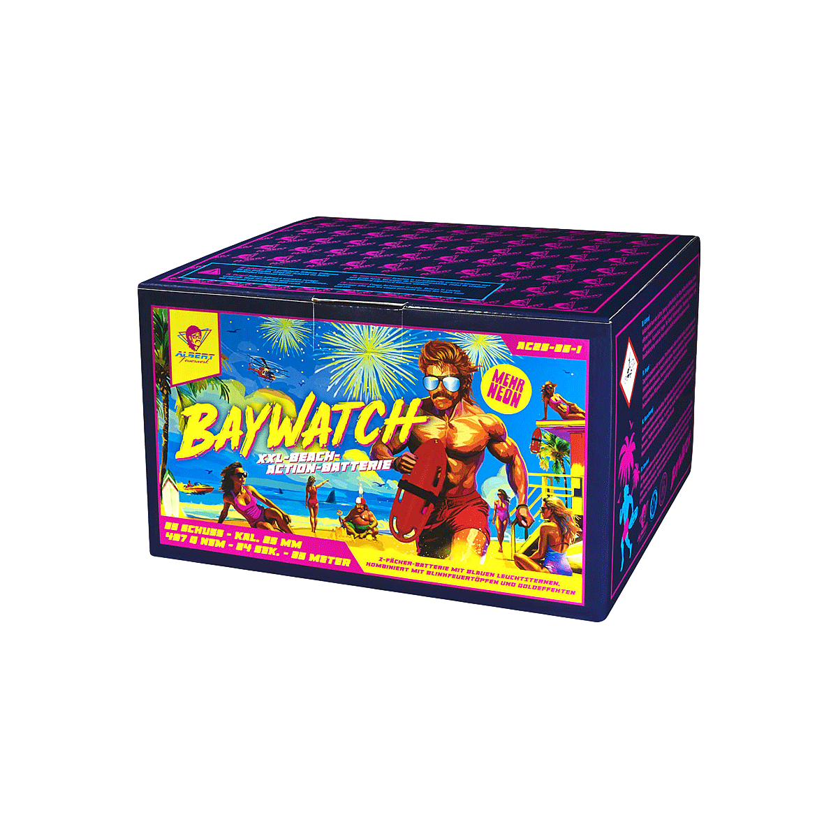 Die Baywatch-Box vom Pyroboss Albert aus dem Hause Funke verzaubert den Strand erst mit im Z-Fächer geschossenen Goldpalmen mit blauen Sternen und Goldaufstieg und Goldblinker-Feuertöpfen. Danach folgen 4 Salven an Goldglitzer-Palmen oder Brokatpalmen, immer mit Schweifaufstieg und Feuertöpfen mit Grünblinkern und blauen Sternen.