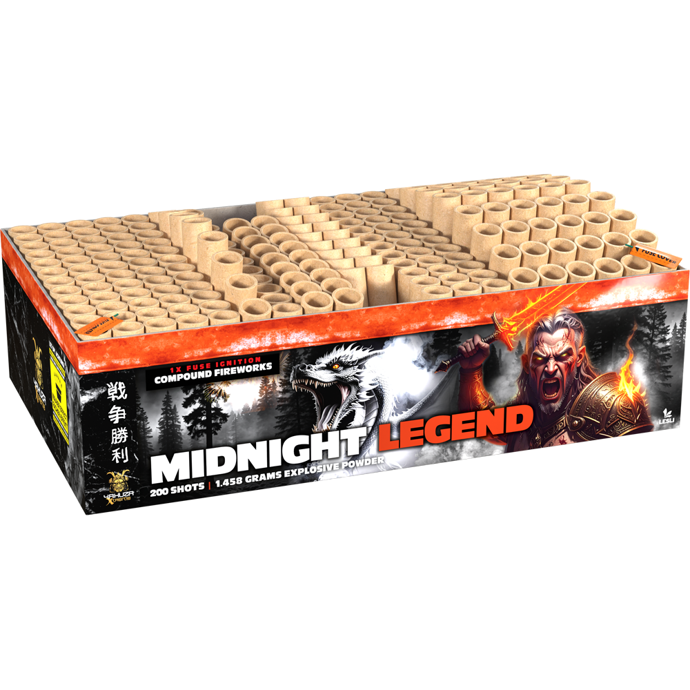 Midnight Legend“ fordert die Nacht heraus! Von blitzschnellen Palmen und Knallsternen bis hin zu funkelnden Chrysanthemen – diese Verbindung versetzt dich mit 200 Schüssen in reine Aufregung und in ein unvergessliches Abenteuer.