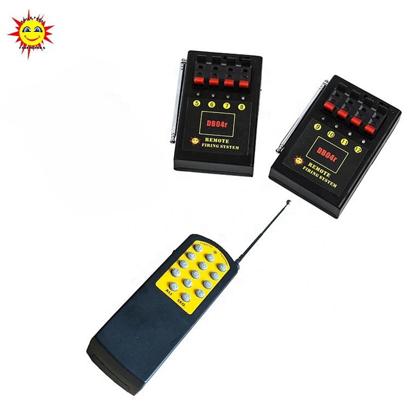 Der Empfänger dieser Zündanlage ermöglicht die separate Zündung von acht unterschiedlichen Kanälen über den mitgelieferten Handsender. dienung verfügt über 12 separate Kanaltasten sowie eine ALL- und SEQ- (Stepper) Taste. Die "ALL"-Taste löst alle Kanäle gleichzeitig aus, muss jedoch aus Sicherheitsgründen länger gedrückt werden, um ein versehentliches Auslösen zu verhindern. Die "SEQ"-Funktion zündet alle Kanäle nacheinander automatisch.